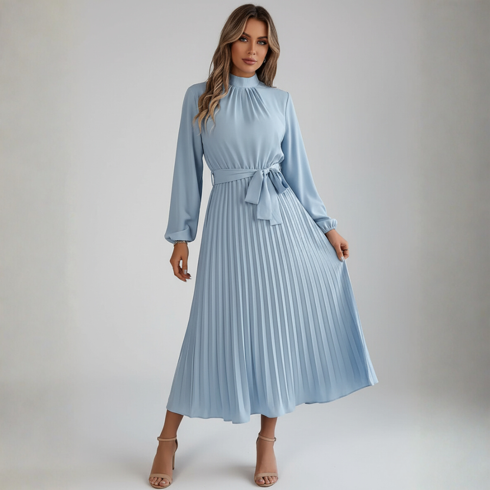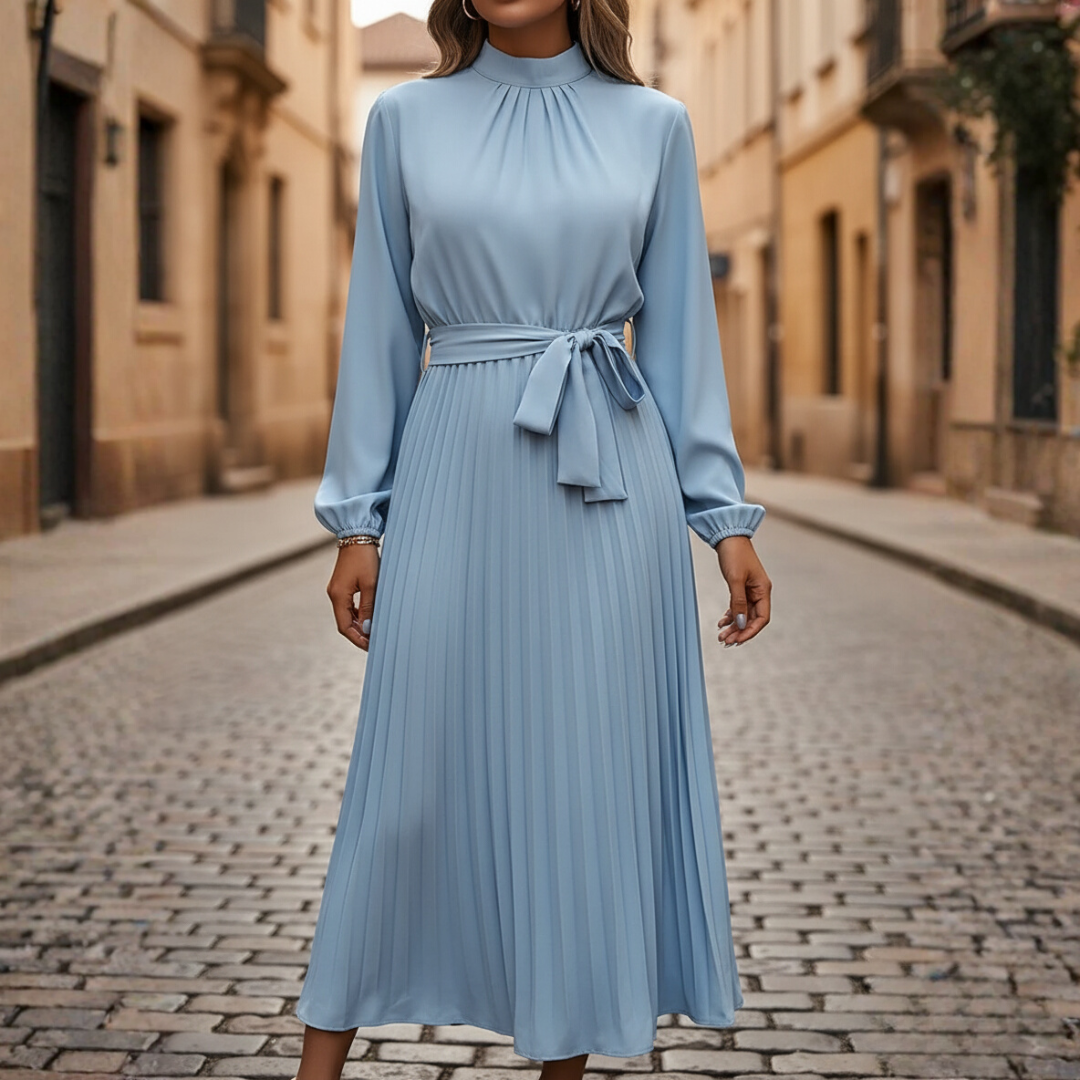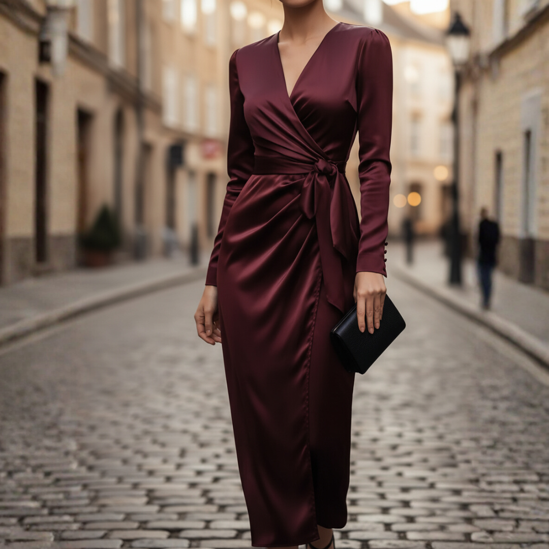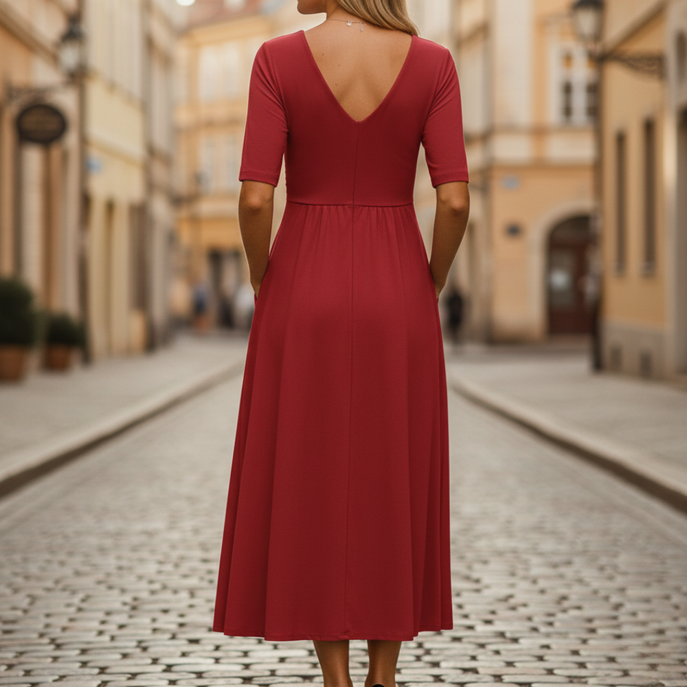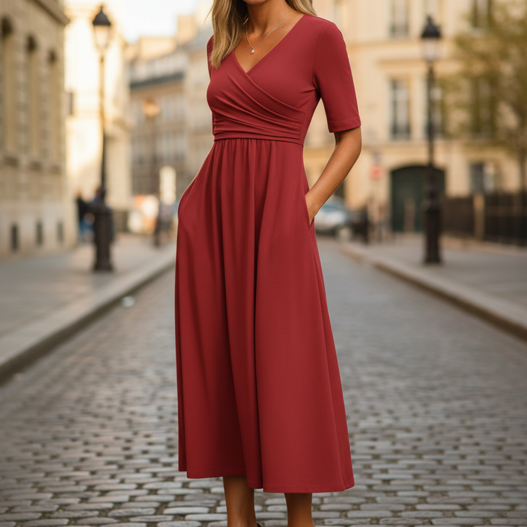 Abito Midi da Donna Lavorato con Pieghe e Scollo a V