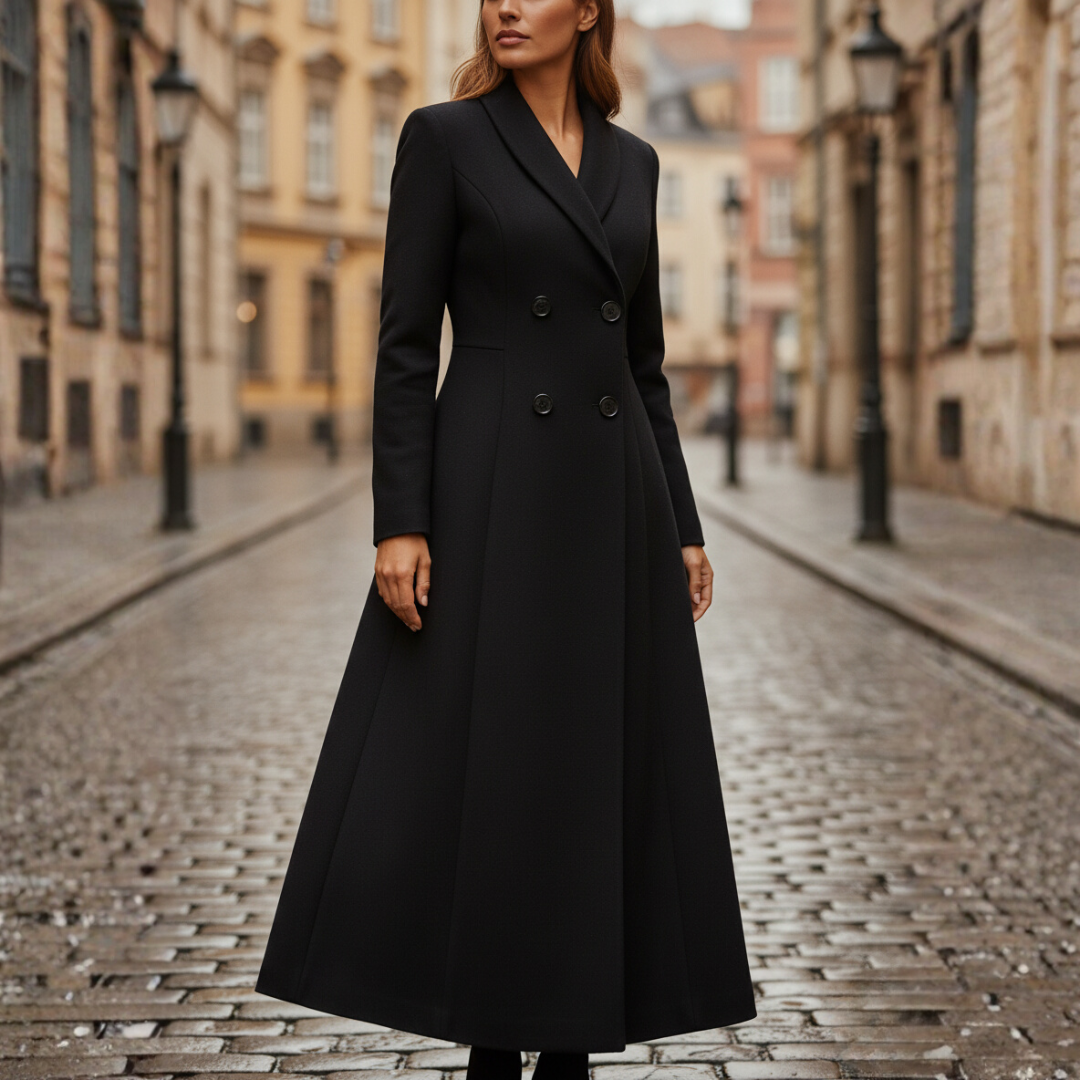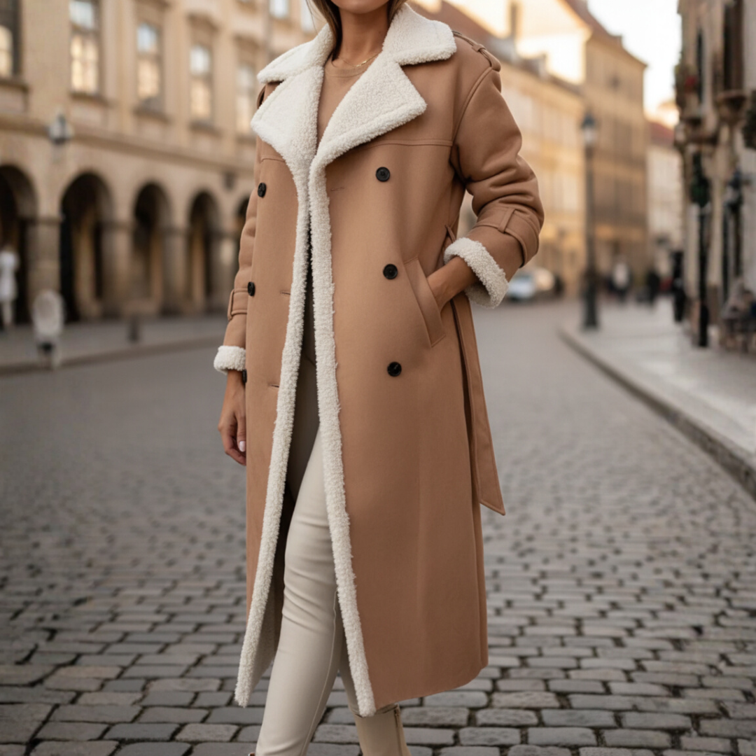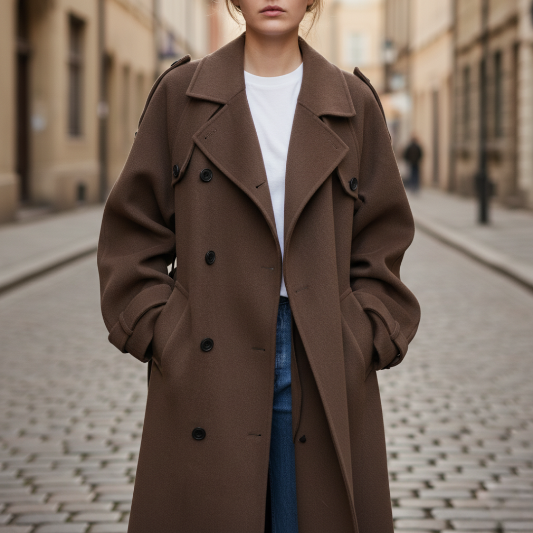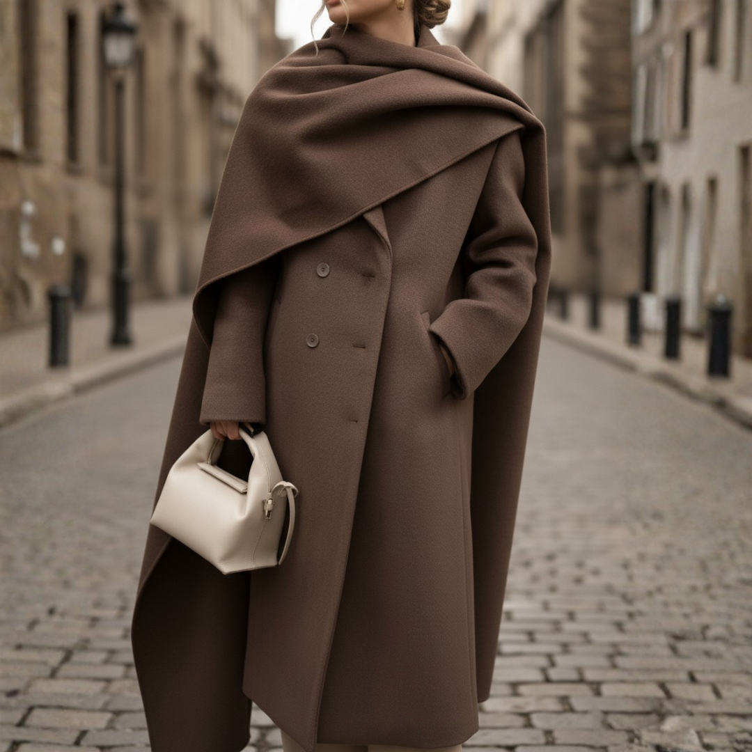 Cappotto Lungo da Donna Marrone con Doppiopetto e Mantella