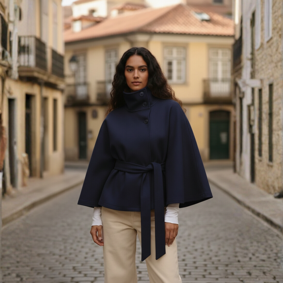 Mantello/poncho da donna disponibile nei colori marrone, blu e beige, realizzato in materiale di alta qualità. Il capospalla corto presenta colletto alto con bottoni e cintura abbinata per regolare la vestibilità. Adatto per la stagione invernale e contesti eleganti o formali.
