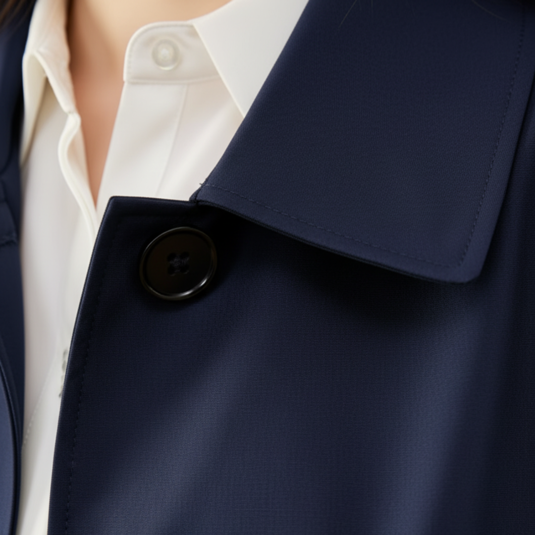 Trench da donna corto realizzato in poliestere, adatto alle mezze stagioni e al layering quotidiano. Il modello presenta una struttura leggera con superficie liscia, pensata per l’uso in contesti professionali e casual. Il design include colletto a revers, abbottonatura frontale e polsini regolabili.