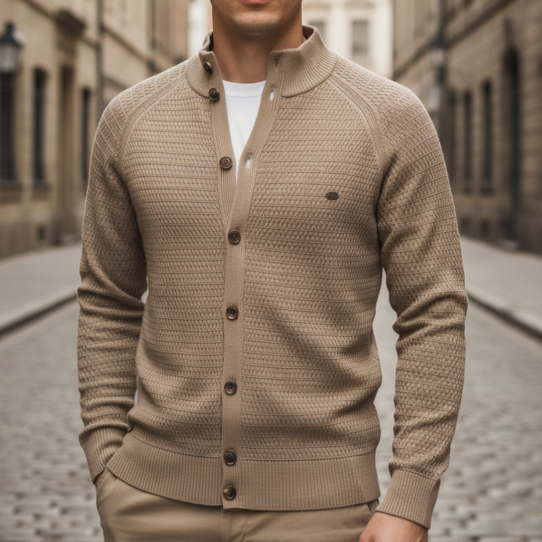 Cardigan da uomo con chiusura frontale a bottoni e colletto alto, disponibile nei colori beige, nero, marrone, verde, grigio e blu navy. Realizzato in filato morbido al tatto, offre comfort e traspirabilità per ogni stagione. La lavorazione a maglia testurizzata dona struttura e definizione alla silhouette maschile, rendendolo adatto a outfit casual o semi-formali.