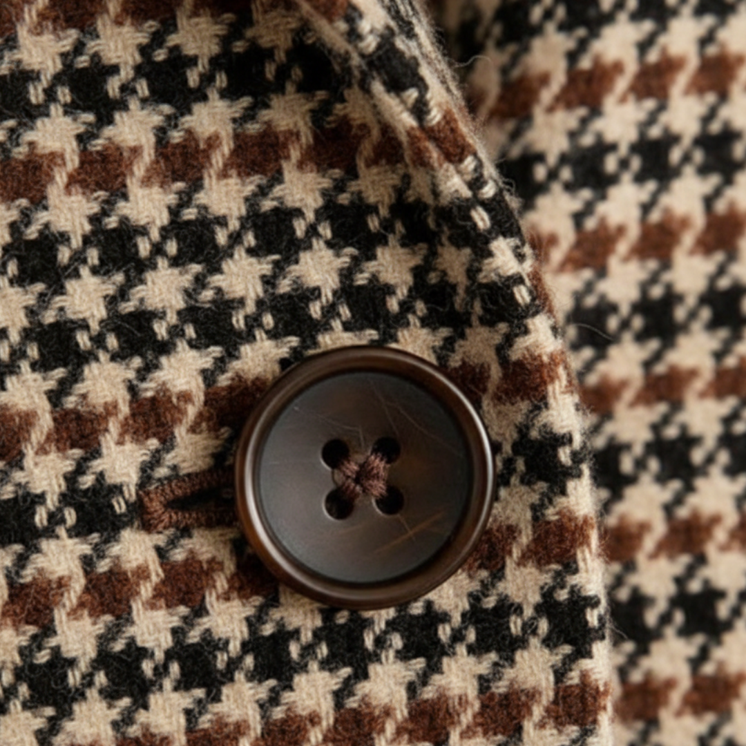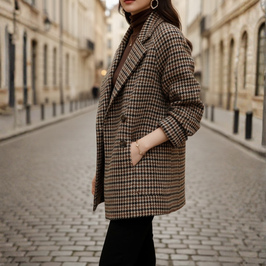 Blazer da donna in tweed di lana misto, adatto alla stagione autunno/inverno. Presenta un motivo a quadri con tonalità marrone, beige e nero. Il modello ha una silhouette oversize con chiusura doppiopetto, bottoni scuri a contrasto e tasche laterali. Il tessuto offre calore ed è adatto a un uso quotidiano in contesti casual o professionali. Può essere indossato sopra camicie o maglie a collo alto.