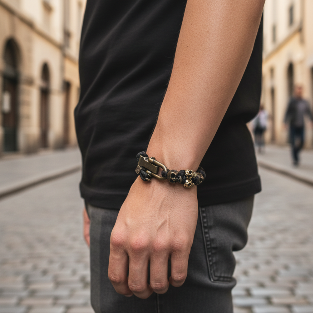 Bracciale Uomo Paracord con Teschi in Metallo Bronzo