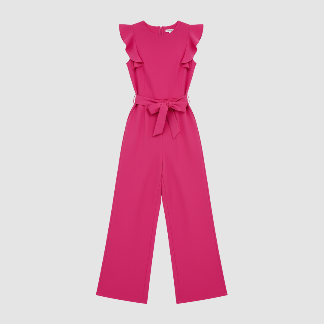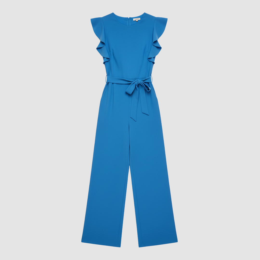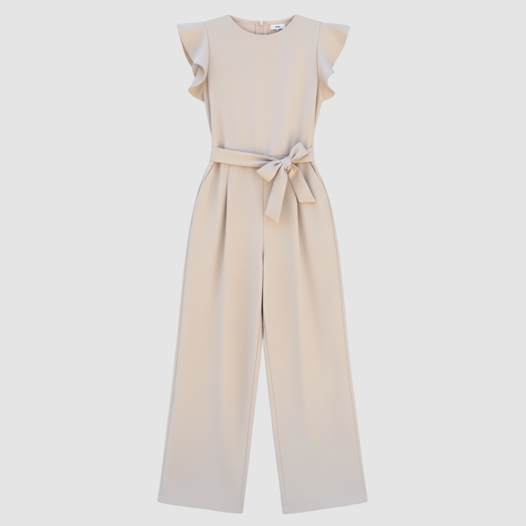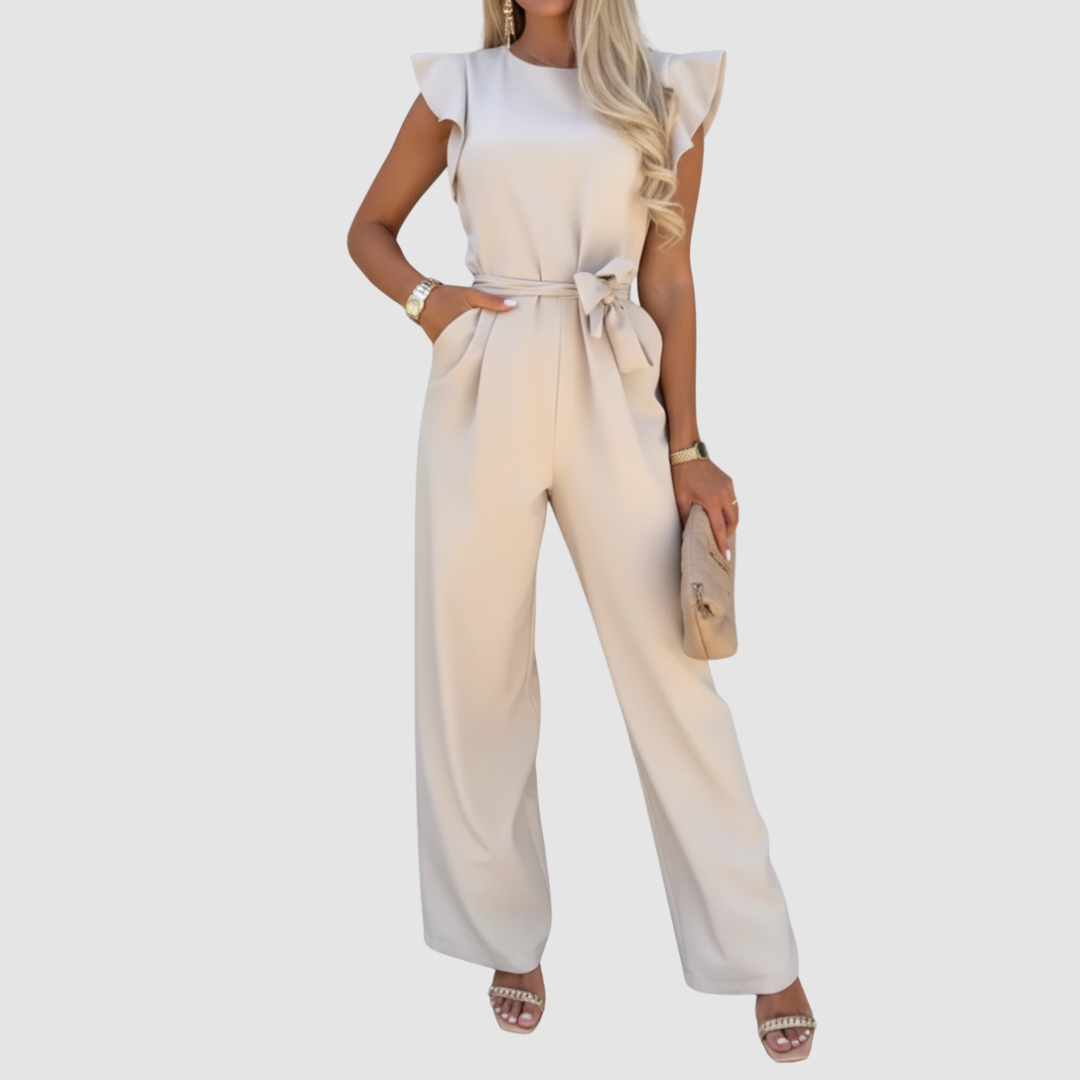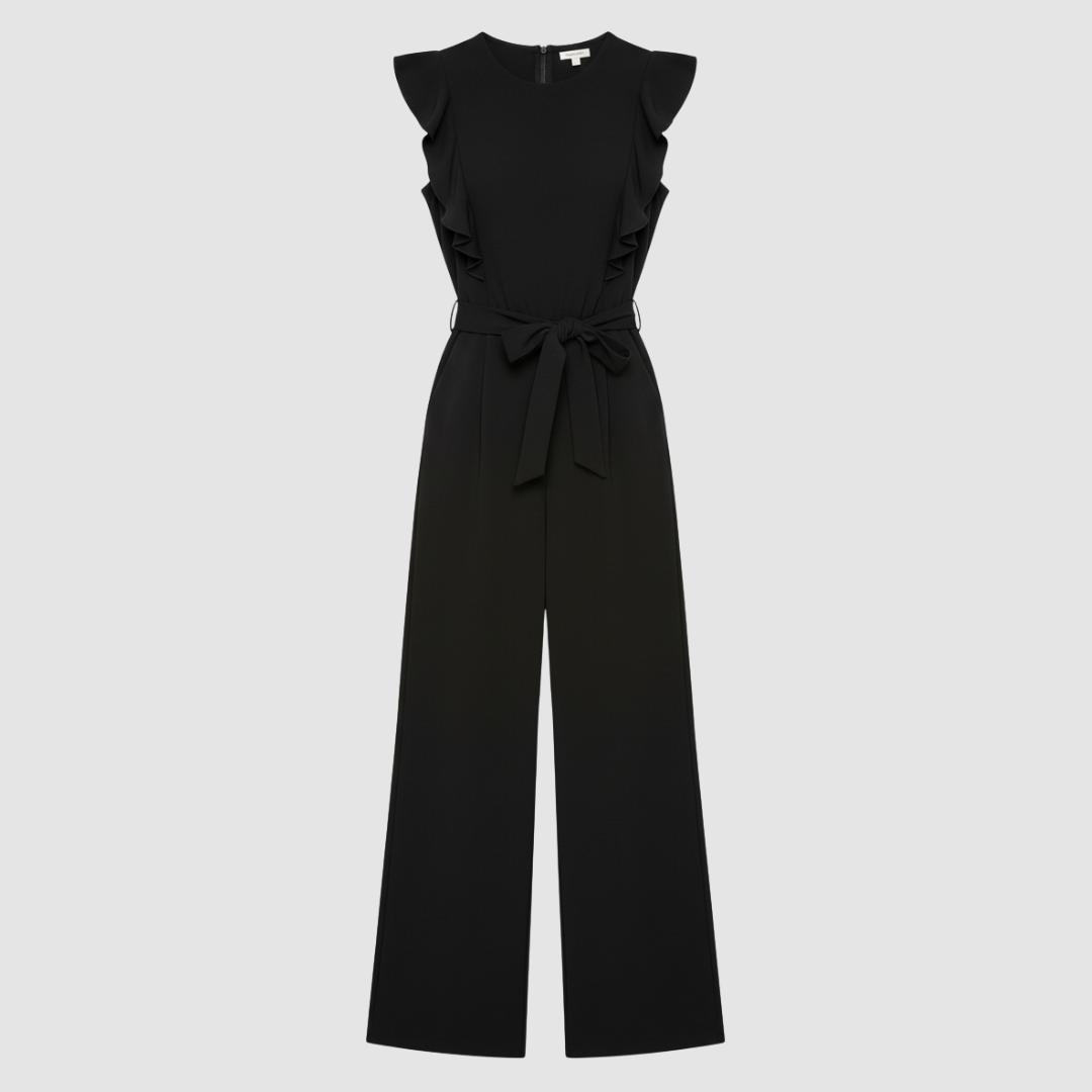Questa tuta intera da donna è caratterizzata da maniche corte con un dettaglio arricciato. Presenta una scollatura rotonda e una chiusura con cerniera lampo nascosta sul retro. La vita è definita da una cintura da annodare abbinata, che permette di regolare la vestibilità. Il pantalone è a gamba larga per un taglio dritto e confortevole.