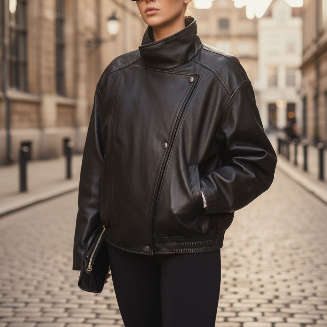 Giacca Bomber in Materiale di Alta Qualità da Donna con Cerniera Asimmetrica e Collo Alto