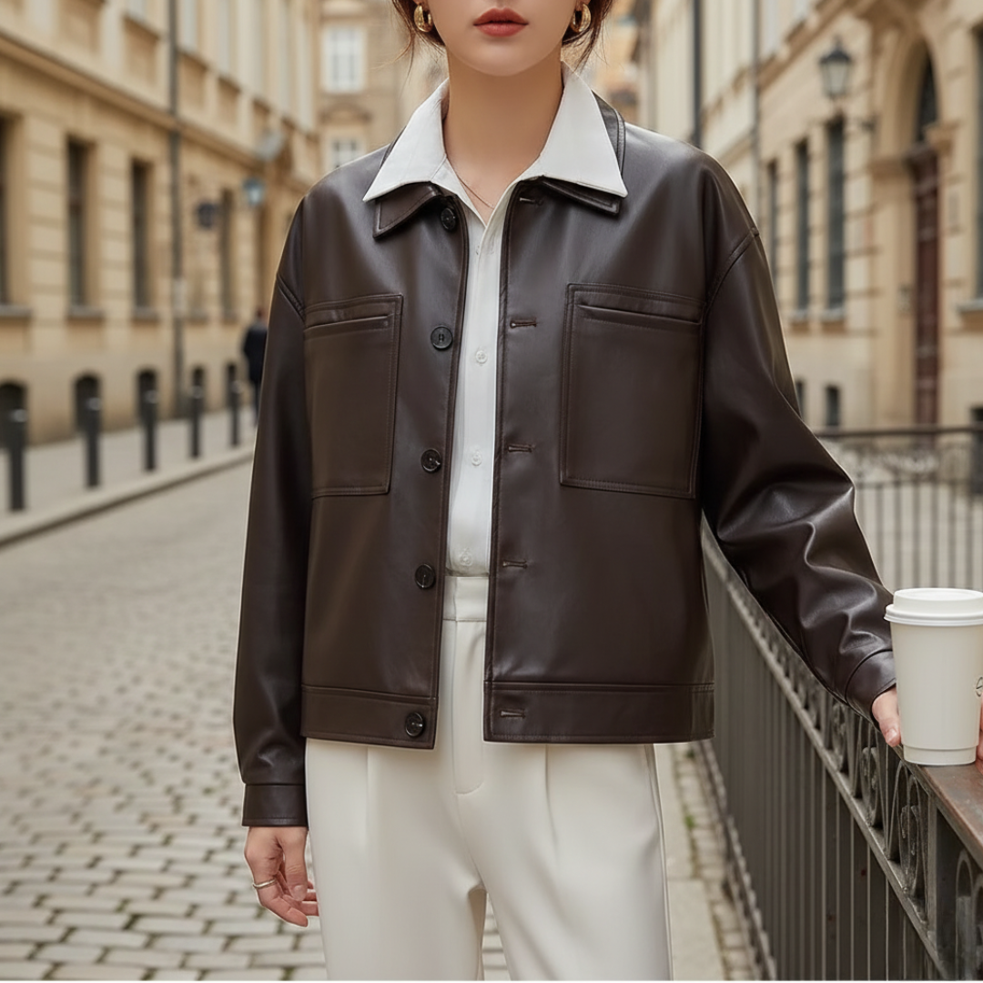 Scopri la giacca da donna in pelle sintetica, un capo versatile che aggiunge stile al tuo guardaroba. Disponibile nei colori nero e marrone, questa giacca con bottoni frontali e due tasche laterali è ideale per le stagioni autunnale e invernale. Realizzata in materiale resistente, offre comfort e praticità. Il design con colletto e bottoni a contrasto la rende perfetta per occasioni casual e semi-formali.