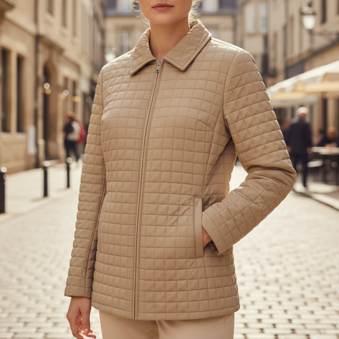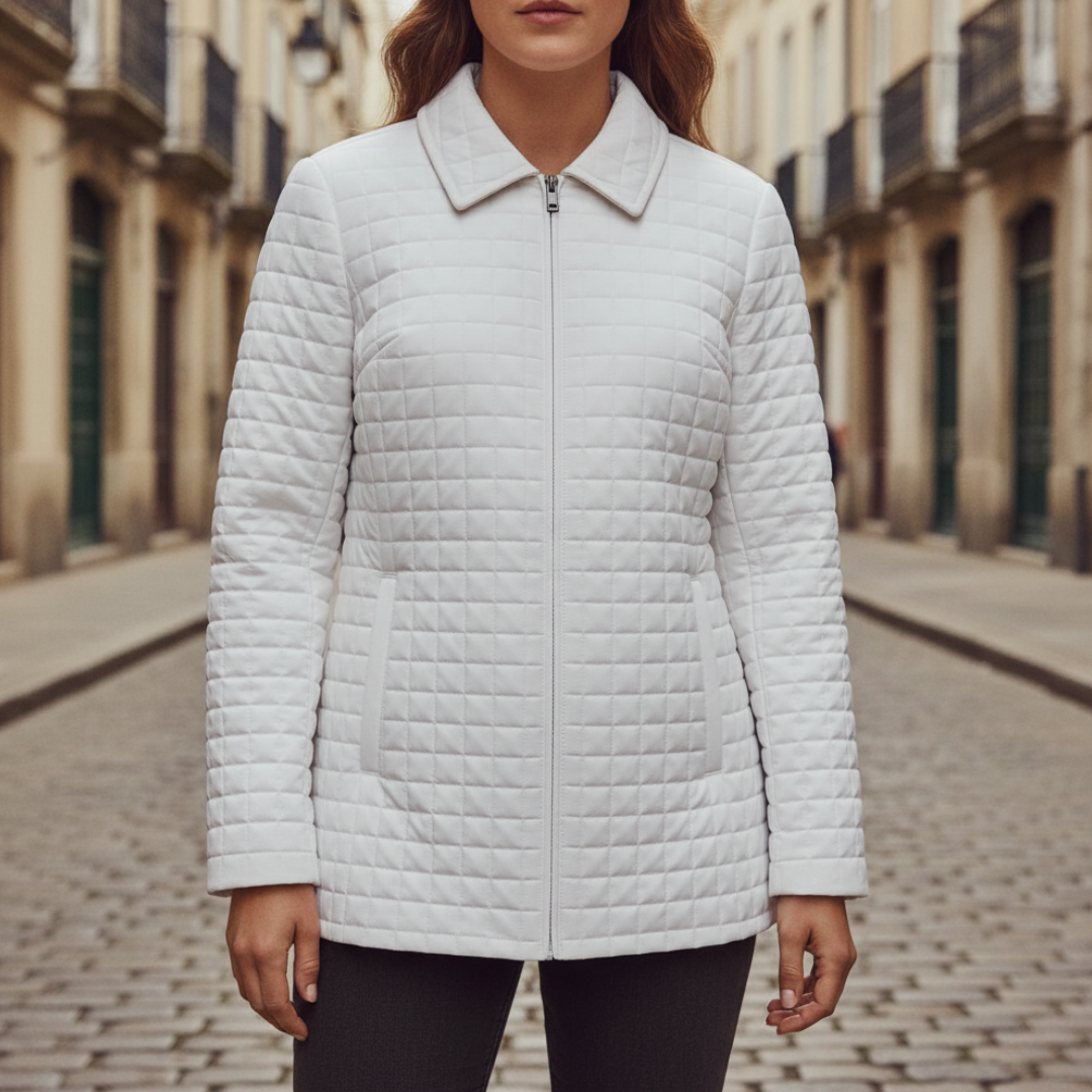 Giacca da donna elegante e pratica, realizzata in tessuto trapuntato. Disponibile nei colori beige, marrone e bianco, questa giacca con zip offre un look sofisticato e funzionale, perfetta per le stagioni più fresche. Il design semplice ma elegante la rende ideale per look casual o da ufficio.