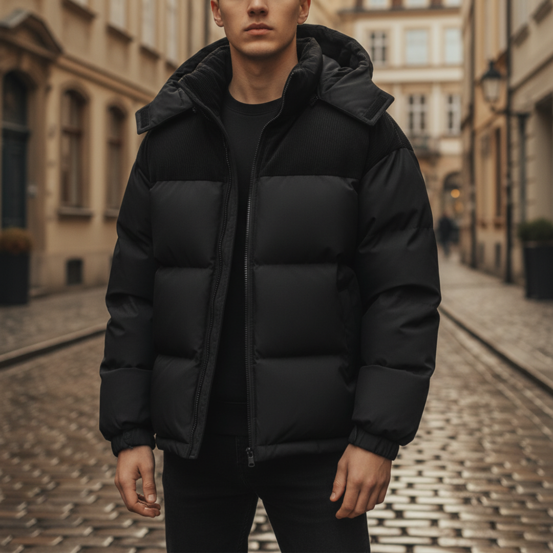 Giacca piumino da uomo con cappuccio, progettata per proteggere dal freddo e dal vento durante le giornate più fredde. Realizzata in materiale resistente, offre comfort e praticità, rendendola ideale per l'uso quotidiano e le attività all'aperto. Il cappuccio regolabile e la chiusura a zip garantiscono una protezione extra, mentre le tasche laterali aggiungono funzionalità.