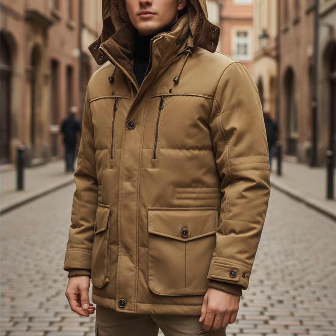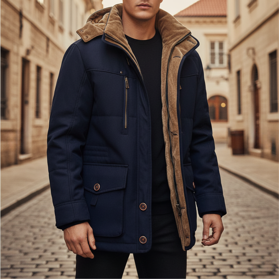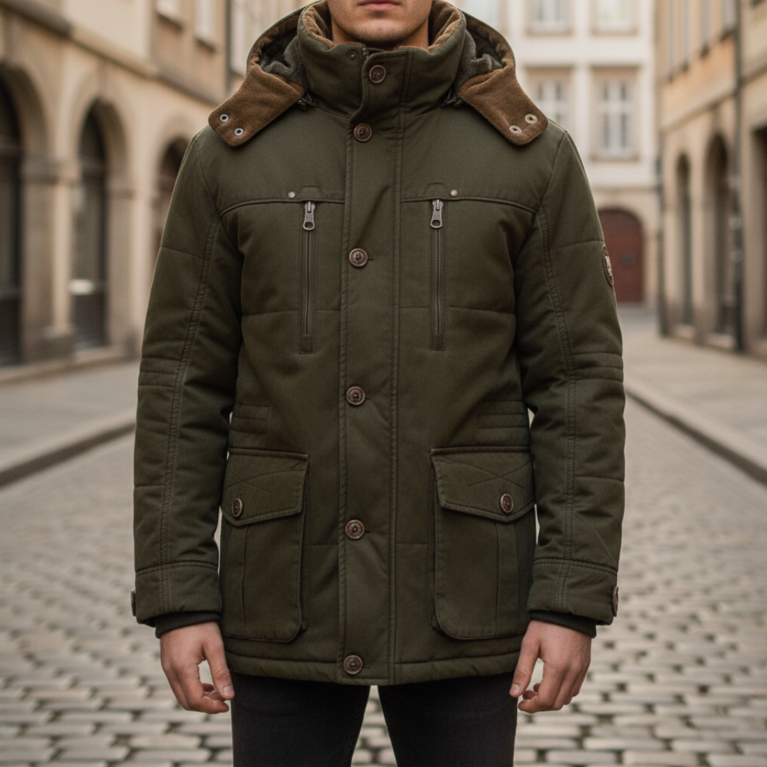 Questa giacca da uomo in blu, realizzata con materiale impermeabile, è progettata per offrire protezione contro il freddo e le intemperie. Il cappuccio con interno in pelliccia sintetica aggiunge un tocco di comfort e stile, mentre il design imbottito garantisce calore e praticità nelle giornate più fredde. Le tasche laterali con bottoni sono pratiche per riporre gli oggetti essenziali. Disponibile anche in marrone e verde, questa giacca è ideale per l'uso quotidiano, sia per occasioni casual che attività all'aperto.