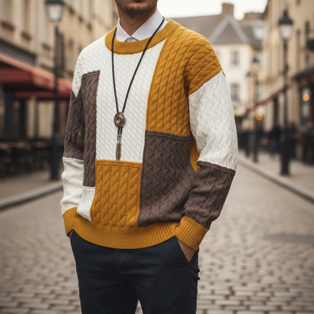 , Stile Europeo CasualIl maglione presenta una scollatura a girocollo e un taglio rilassato che si adatta a ogni corporatura. I motivi a treccia sui pannelli colorati aggiungono una texture ricca e un tocco artigianale. Perfetto da abbinare a jeans per un look quotidiano o a pantaloni chino per un'uscita serale, questo capo è un'aggiunta versatile e alla moda al guardaroba di ogni uomo.