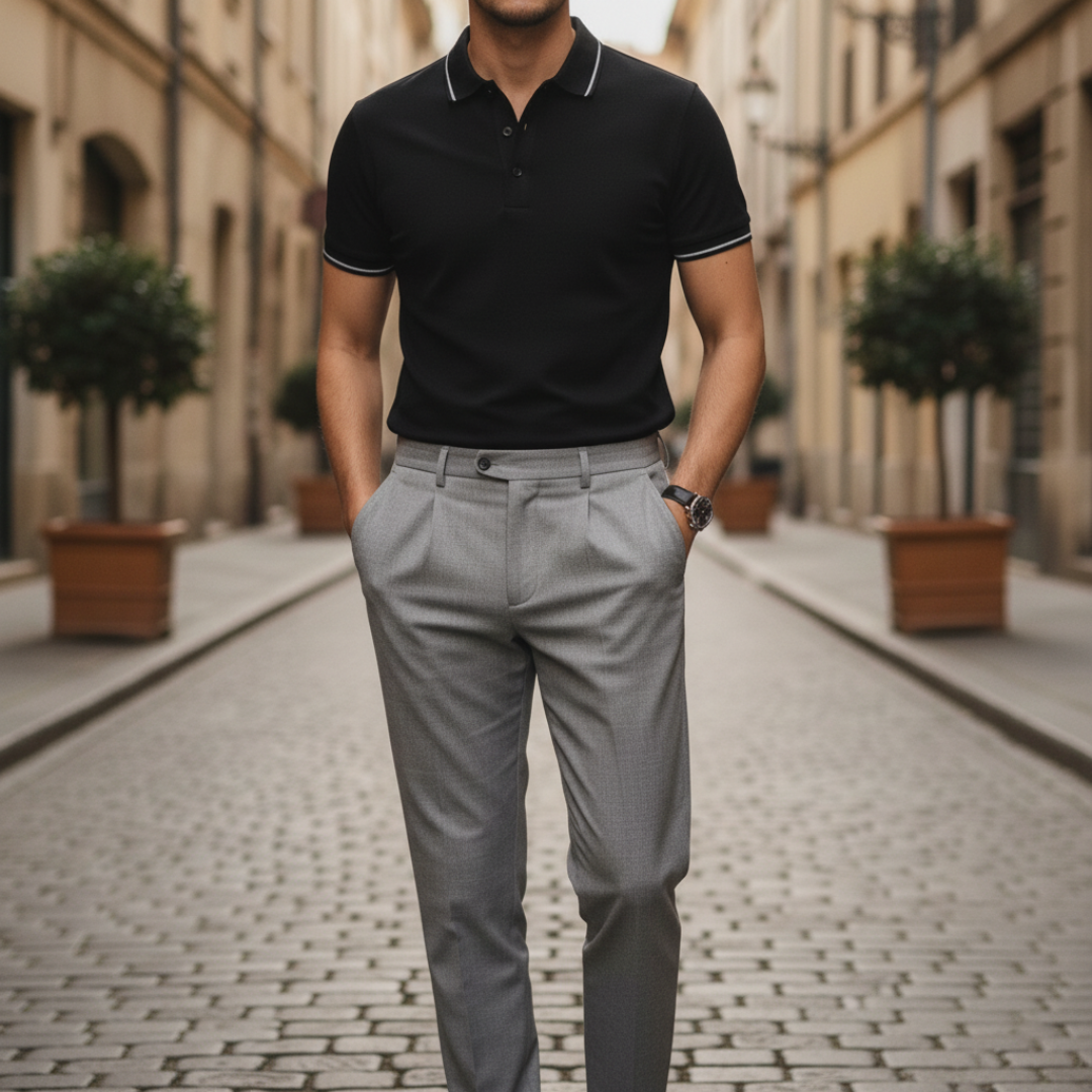 Polo da uomo in materiale di qualità, adatta a contesti casual e smart casual. Disponibile nei colori bianco, nero e grigio. Il tessuto favorisce traspirabilità e comfort.