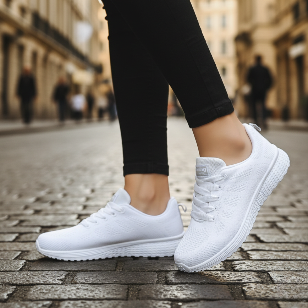 Le scarpe da corsa per donna sono adatte per allenamenti e uso quotidiano. Il materiale mesh traspirante favorisce la ventilazione, mantenendo i piedi freschi durante l'attività fisica. La suola bianca in gomma è resistente e antiscivolo, offrendo stabilità su vari tipi di superficie. Disponibili in nero, blu, grigio e bianco, queste scarpe sono pratiche e confortevoli per l'uso quotidiano o attività sportive.