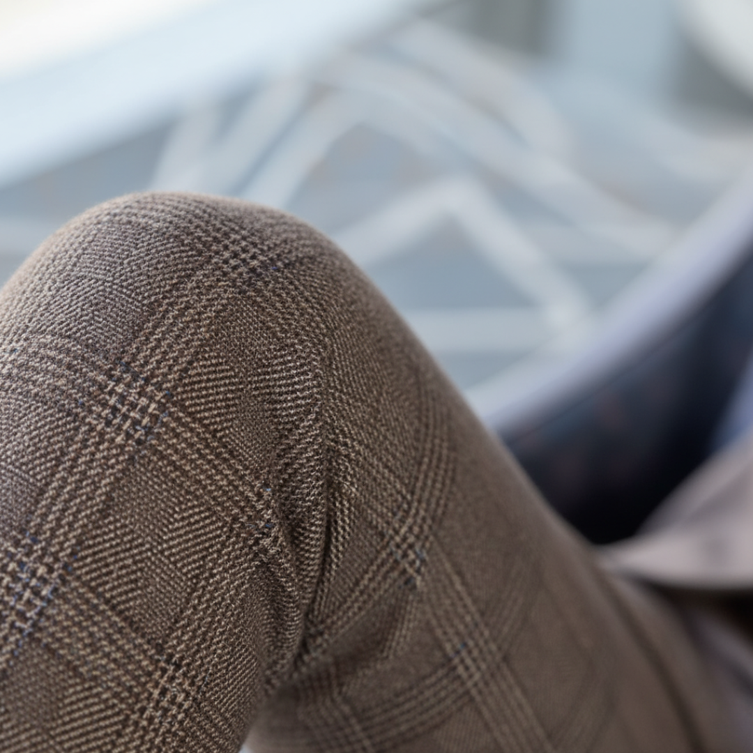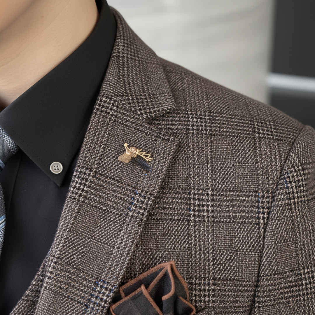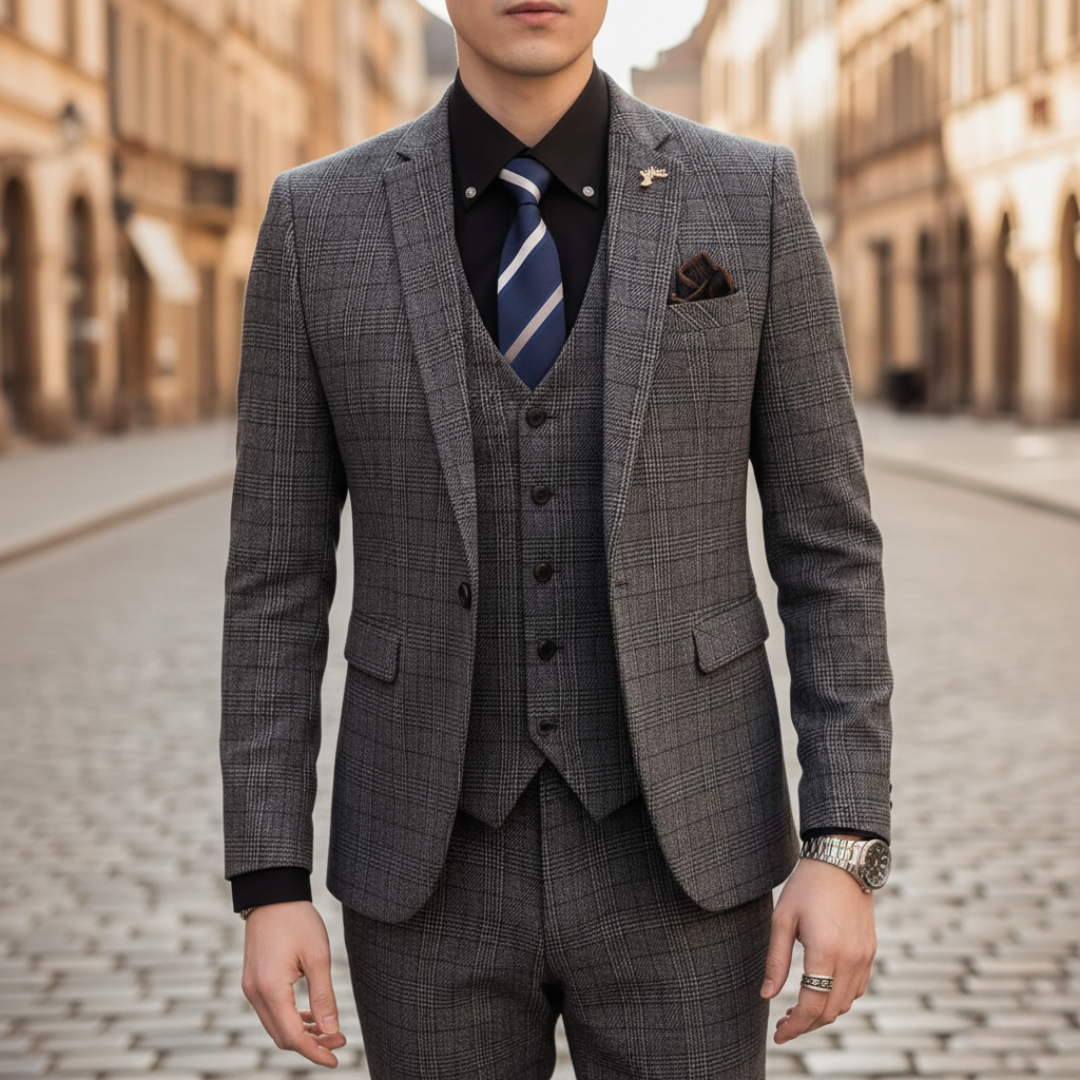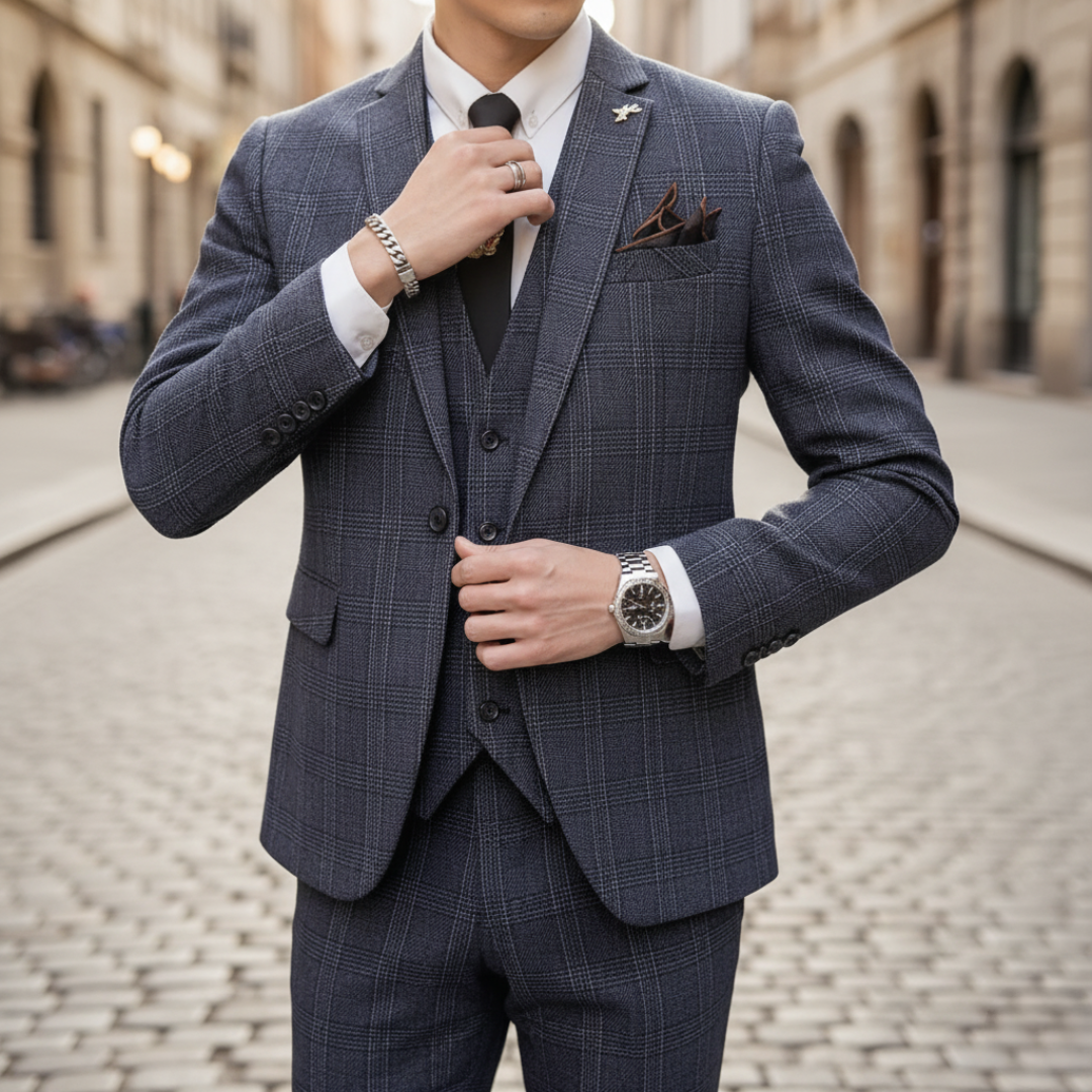 Herrenanzug bestehend aus drei aufeinander abgestimmten Teilen aus Karostoff. Das Set umfasst Sakko, Weste und Hose, die für den Einsatz in formellen Anlässen, Zeremonien oder beruflichen Umgebungen konzipiert sind. Der strukturierte Stoff und der maßgeschneiderte Schnitt bieten eine reguläre Passform und eine definierte Linie. Erhältlich in den Farben Blau, Braun und Grau.