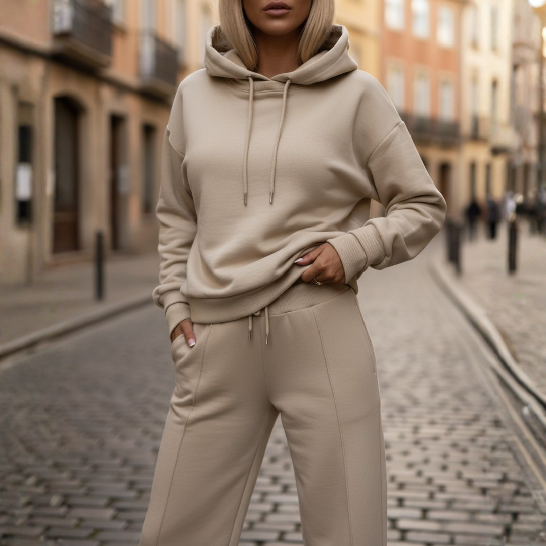 Women's jumpsuit consisting of two coordinated pieces, made from soft fabric. The set includes a hoodie and wide-leg pants, designed for everyday use, leisure, or travel. The regular fit and flexible structure promote comfort and freedom of movement. Available in beige, black, blue, brown, gray, and violet colors.