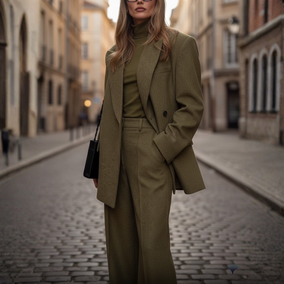 Conjunto de Mujer en Lana con Blazer de Un Solo Botón y Pantalones de Pierna Ancha