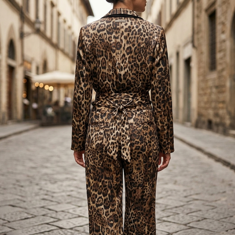 Conjunto de Mujer Blazer Cruzado con Cinturón y Pantalones Estampados de Leopardo
