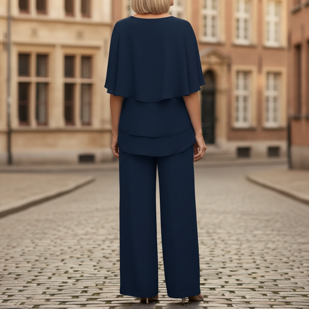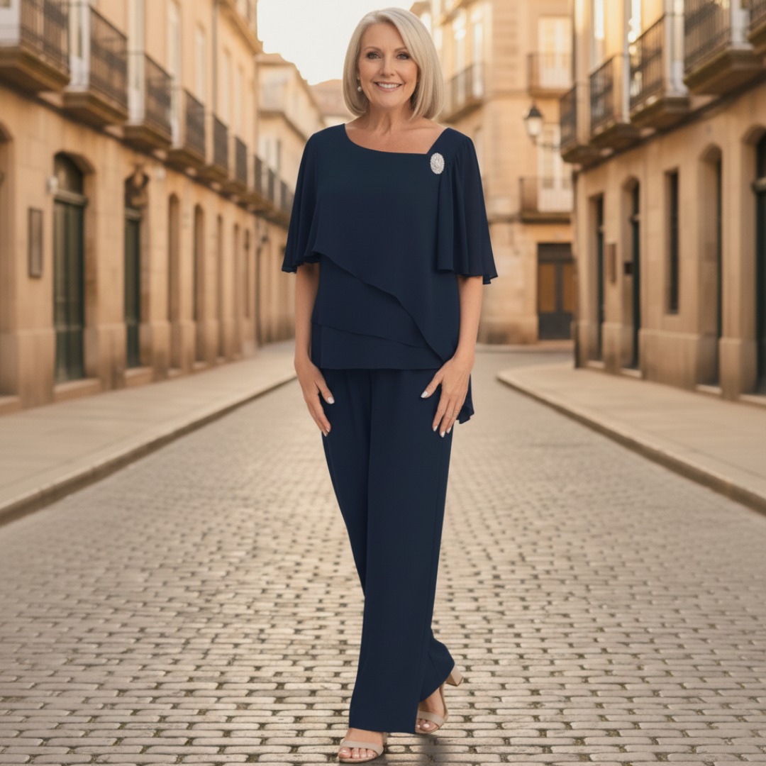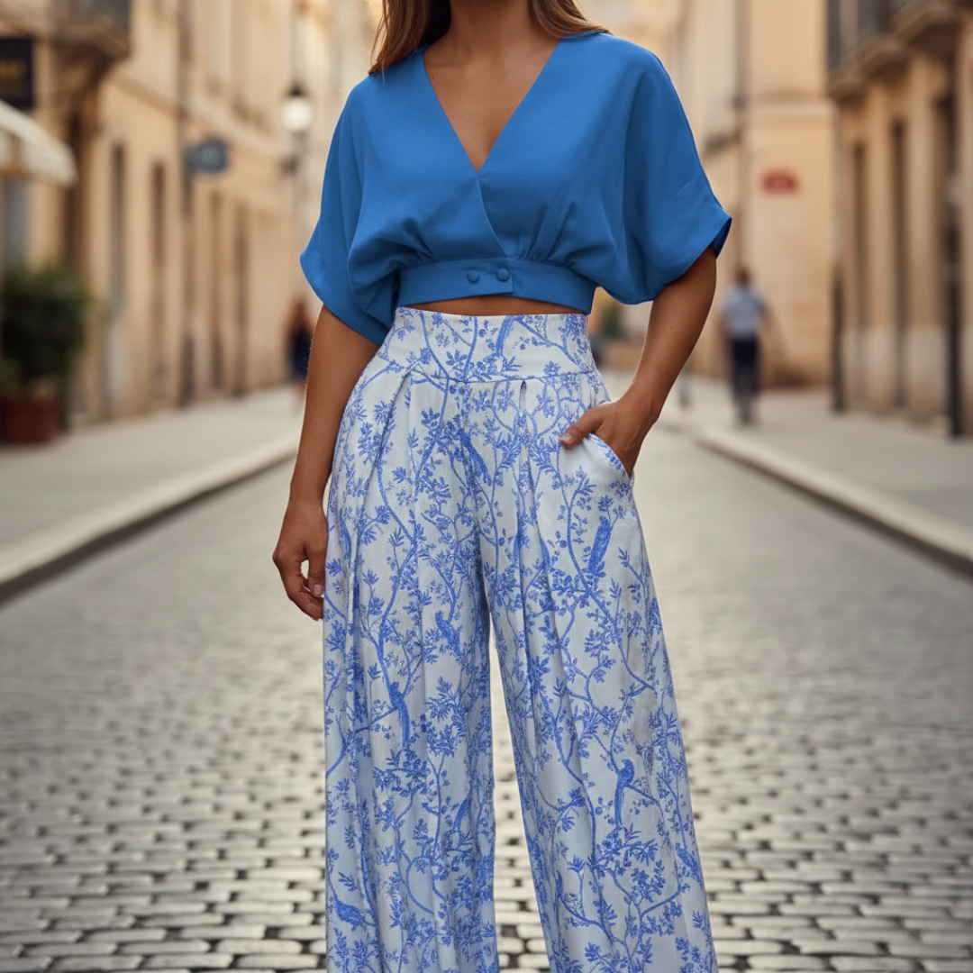 Conjunto elegante de pantalón para mujer con blusa fluida y pantalones anchos