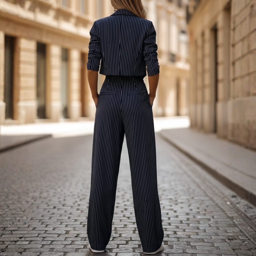 Conjunto Elegante de Mujer con Blazer Crop y Pantalones a Rayas