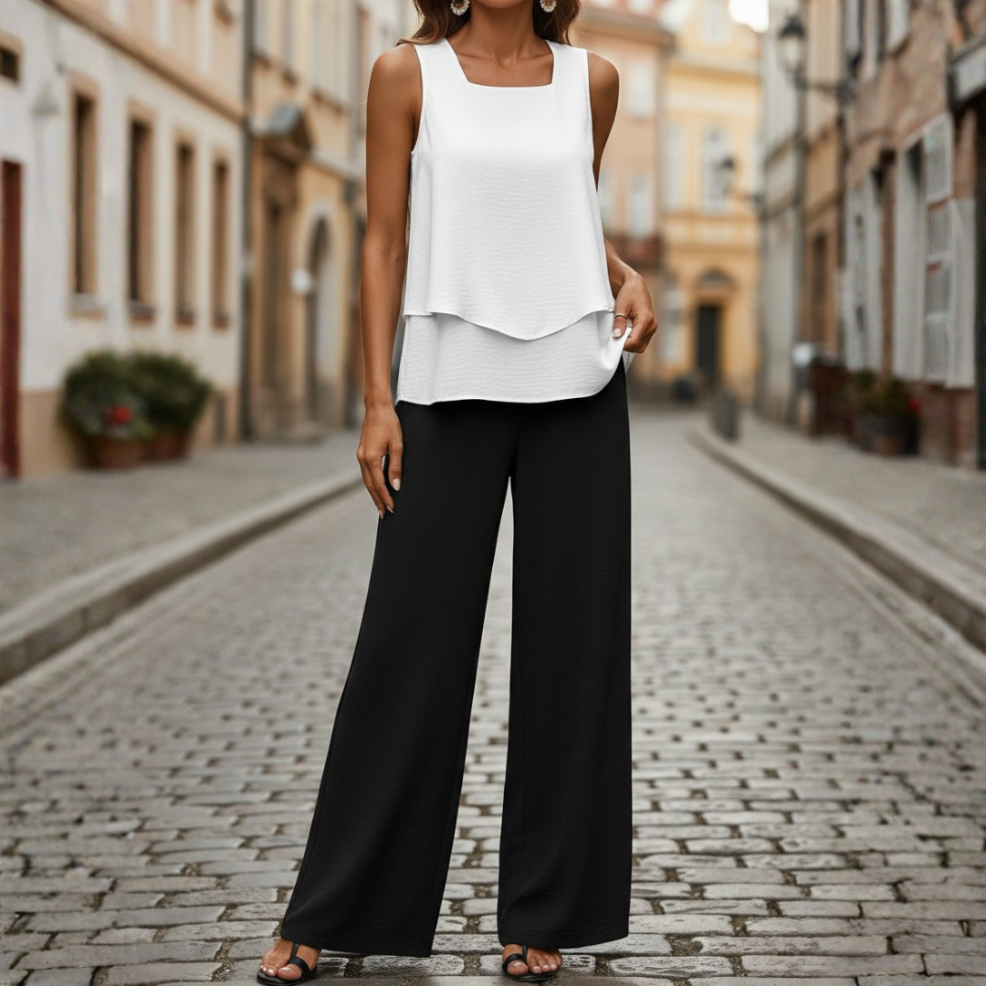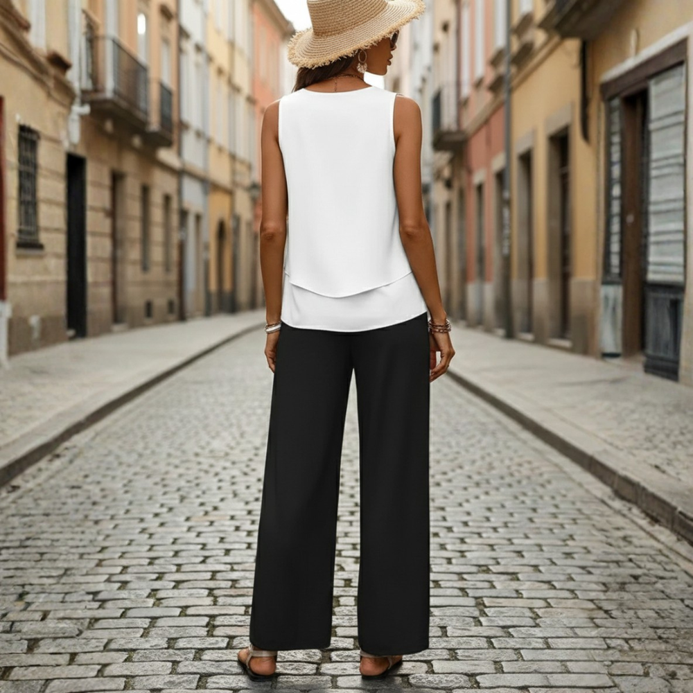 Conjunto de Dos Piezas Top de Capas sin Mangas Pantalones Anchos Mujer